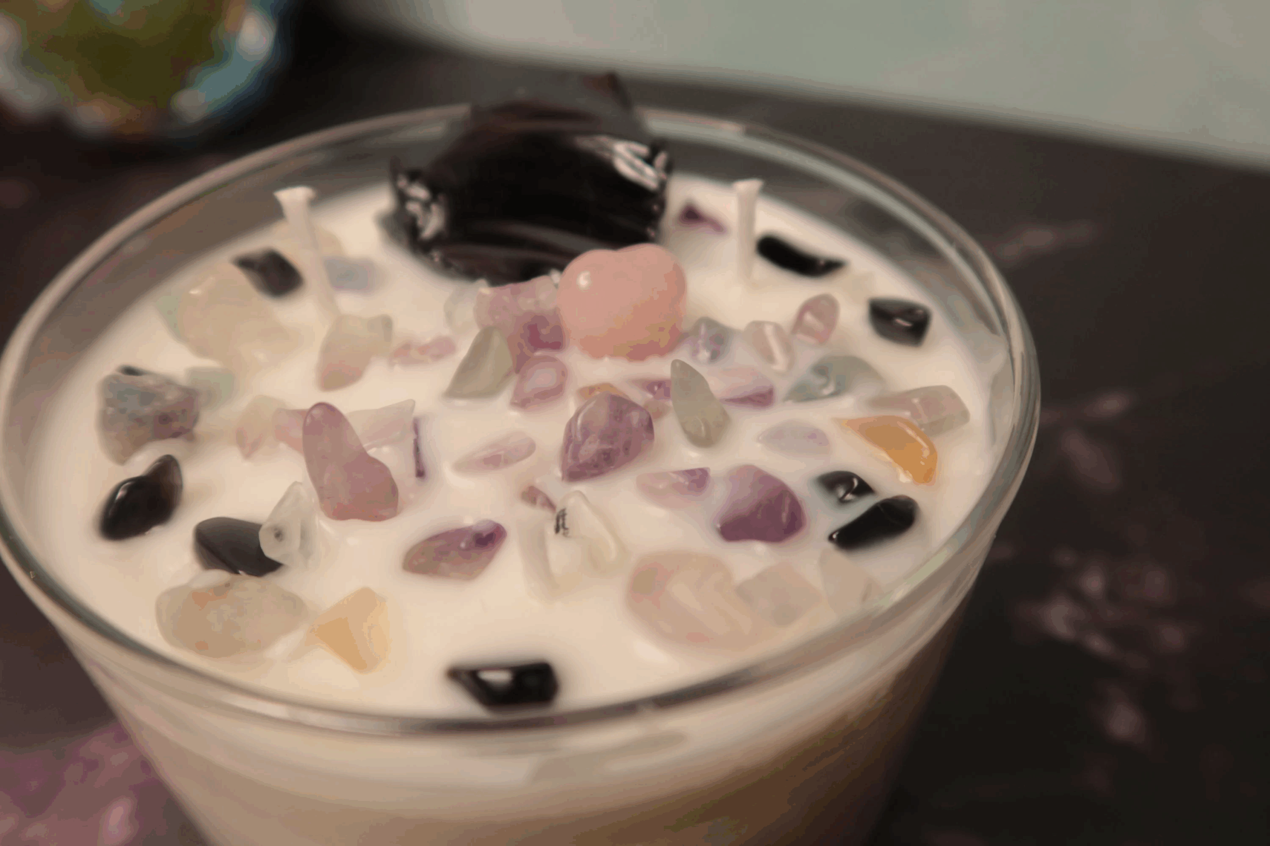 This candle is to be used along with affirmations to protect you against bad/harmful energies. It includes an essential oil blend with properties of healing, cleansing, and soothing energies, as well as corresponding crystals. Black obsidian & Fluorite for Clarity, Cleansing your aura, consciousness and protection. rose quartz, and amethyst.